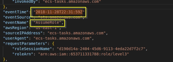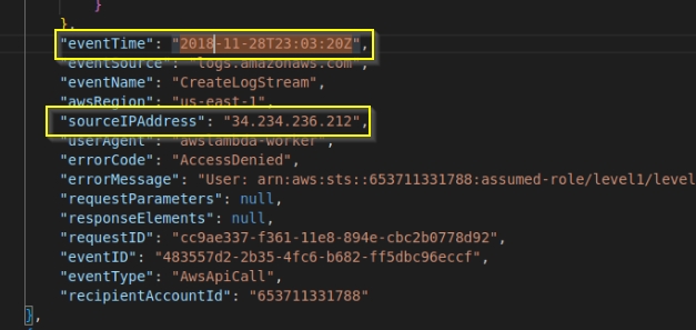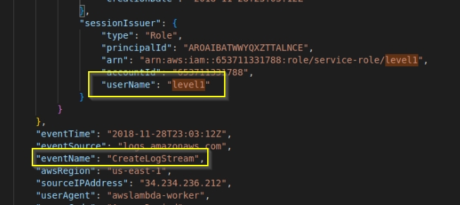Why? If we search for level1 username and compare the times of the events we see that CreateLogStream was the earliest time.