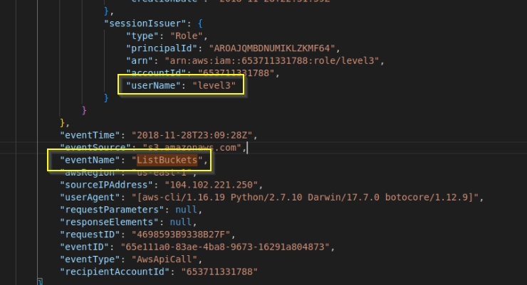 Why? If we search for the event named ListBuckets we can find the username tag with the user associated with that event
