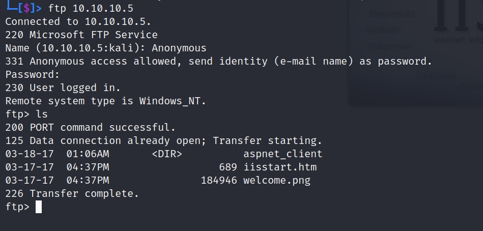 From our nmap scan we see that ftp allows Anonymous logins. We use the ftp command in the terminal.