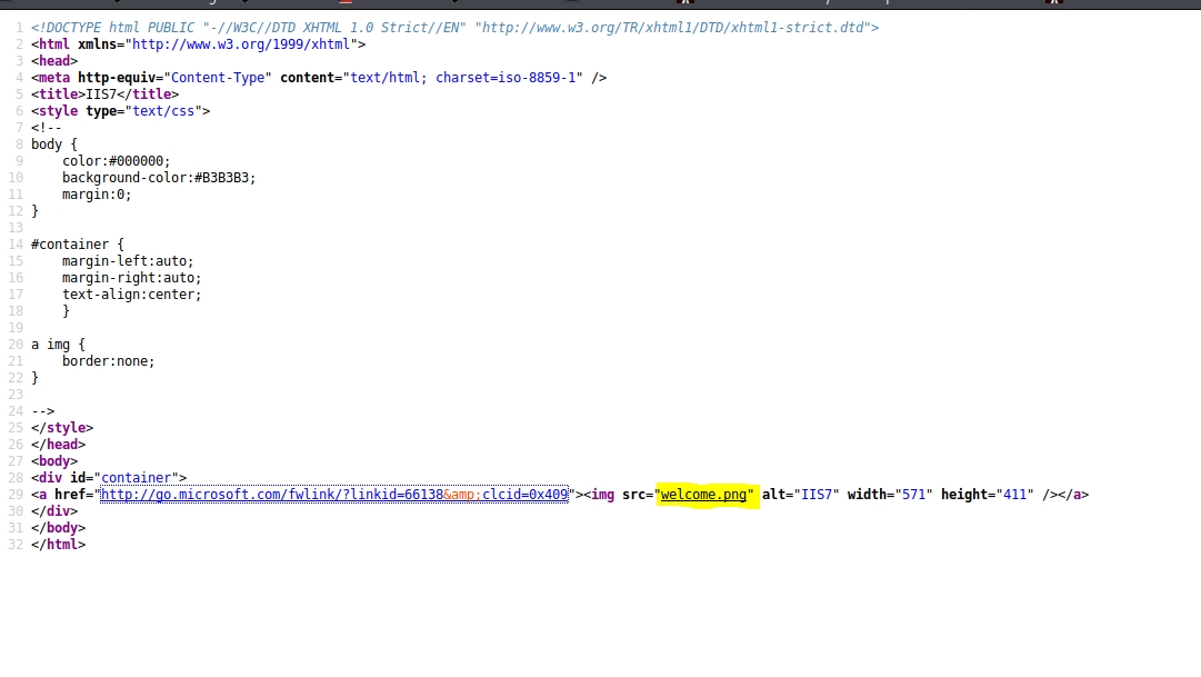 It appears we have some sort of welcome page? At first glance we see IIS7. And if we click the web page we get taken to a microsoft web page that talks about IIS.