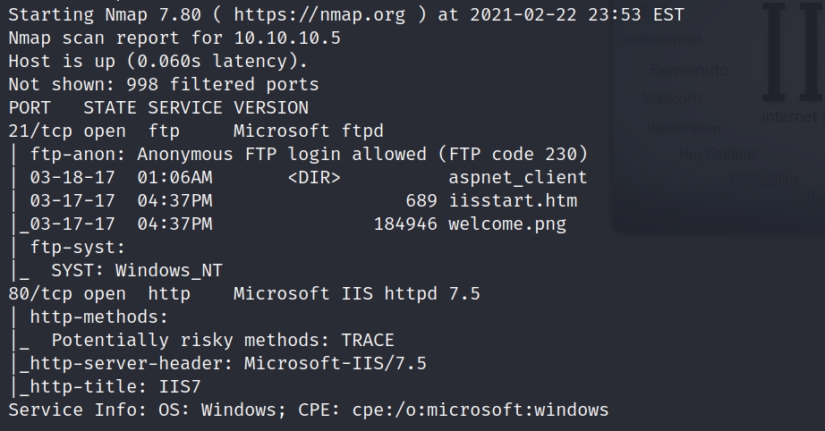 From the nmap scan results we see that port 21 and 80 are open.