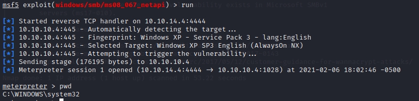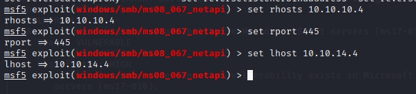Staying the Metasploit console we enter use exploit/windows/smb/ms08_067_netapi to start the module. We then enter the target ip and port numbers which in this case are 10.10.10.4 and 445. And set our host ip which will be kali.