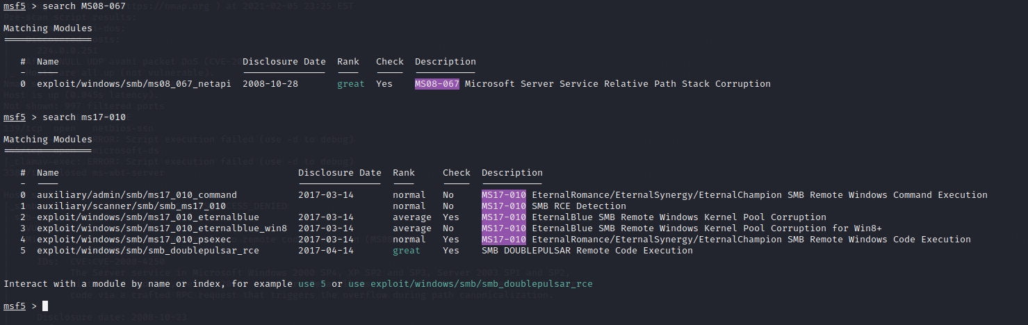 Out of all of these exploits, the MS08-067 Microsoft Server Service Relative Path Stack Corruption and the MS17-010 EternalRomance/EternalSynergy/EternalChampion SMB Remote Windows Code Execution seem to be the most promising. So let's try the first one and see what happens...