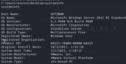 To get some hint of what we should be looking for we can use the systeminfo command within our reverse shell.