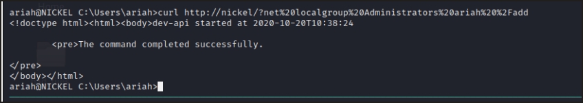 And ye it worked, so next best thing is lets just use a url encoded net command to add ariah to the admin group.