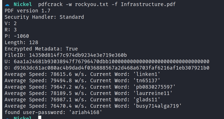 And the pdf is password protected so I ran pdfcrack on it and was able to get the password for it.